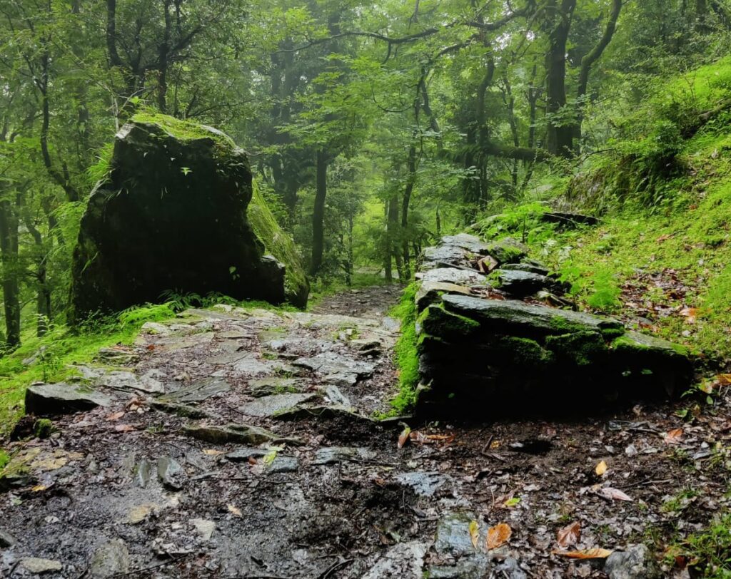 After about an hour, enter a dense forest of oak and local trees known as Mohru and Pangar, their thick canopy creating a cool, shaded path that feels like a step into the wild. The trail is well-marked and beginner-friendly, with a gradual climb of about 848 meters.